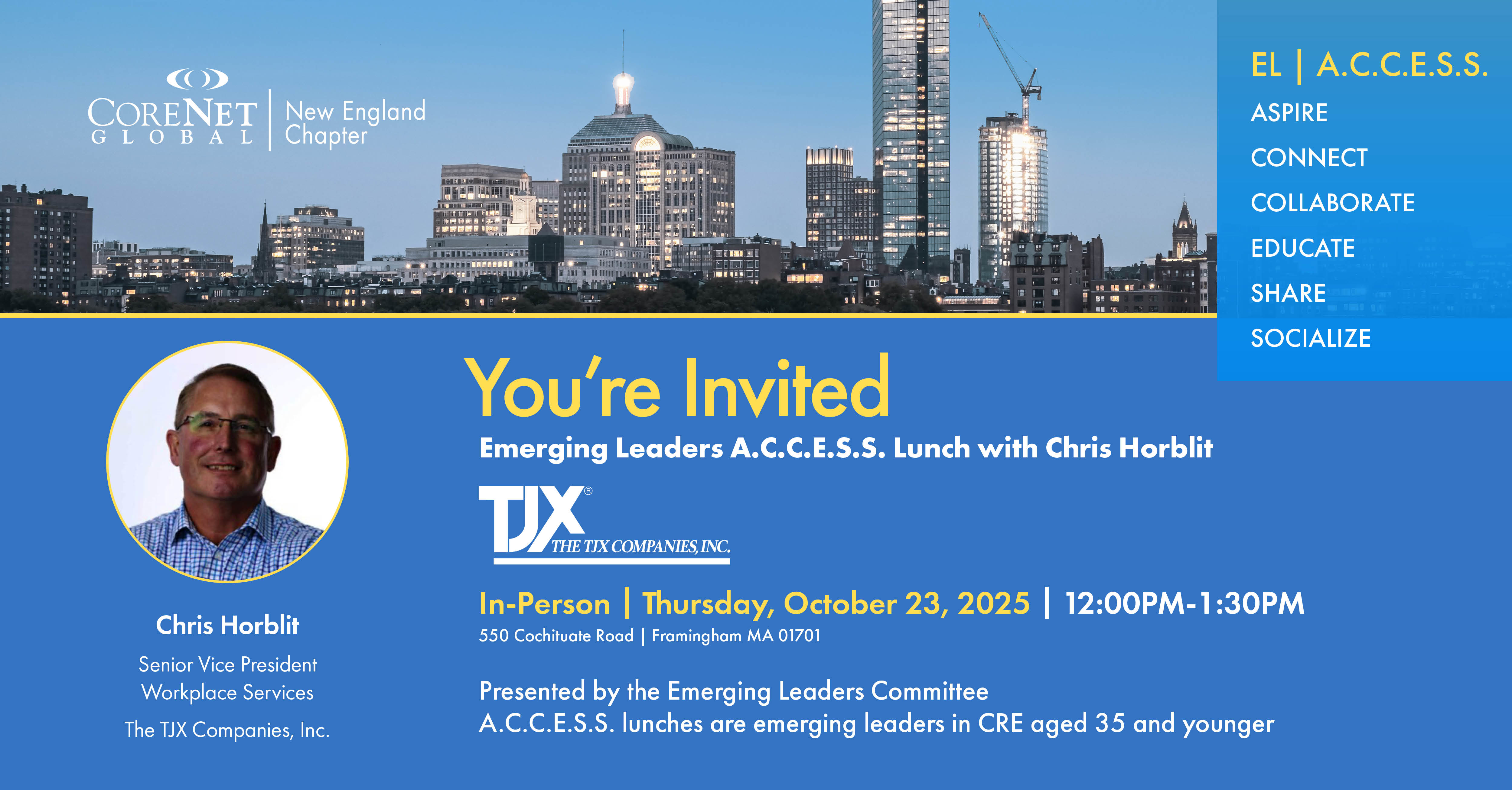 A small group of CoreNet Global - New England Chapter Emerging Leader members will have the unique opportunity to have lunch with an established CoreNet Global Member and Past President - Chris Horblit, Senior Vice President - Workplace Services with The TJX Companies, Inc. Chris will discuss networking, professional development, his career path, the benefits of CoreNet Global involvement, etc.
