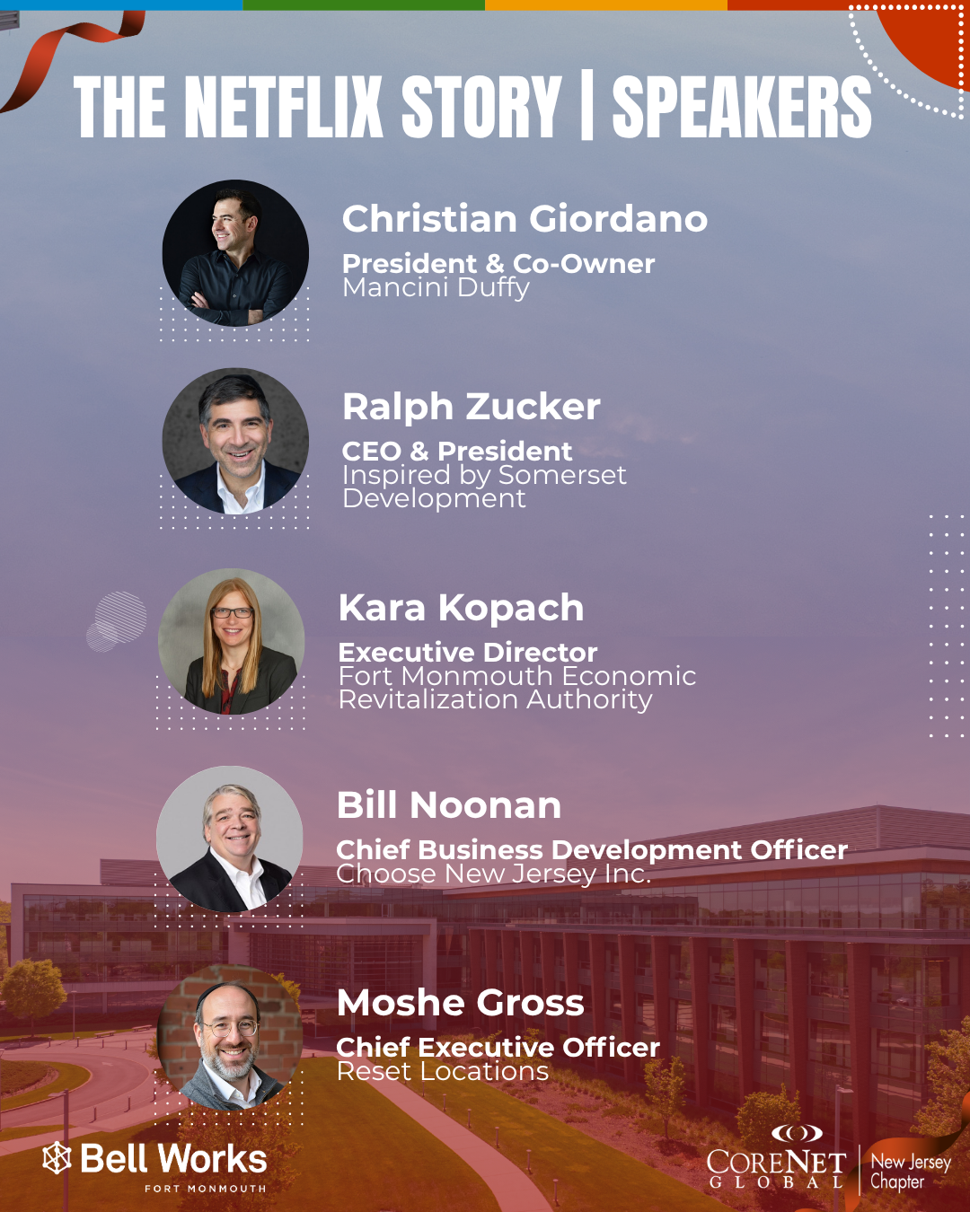 On Thursday morning, November 20th, CoreNet NJ members are invited to Bell Works Fort Monmouth (BWFM) for an exclusive event exploring “The Netflix Story” - the vision and strategy behind Netflix’s transformative $1 billion studio development spanning over 290 acres at the former Fort Monmouth Army base in Oceanport and Eatontown. Hosted at BWFM, this event features leading voices at the heart of the transformation, including Christian Giordano (President & Co-Owner, Mancini Duffy), Kara Kopach (Executive Director, Fort Monmouth Economic Revitalization Authority), Ralph Zucker (CEO & President, Inspired by Somerset Development), Bill Noonan (Chief Business Development Officer, Choose New Jersey Inc), and Moshe Gross (Founder & Principal, Reset Locations). Enjoy coffee, a dynamic panel discussion on what it took to bring Netflix to New Jersey, and a behind-the-scenes building tour of BWFM itself. Registration details will follow soon - mark your calendar for this can’t-miss experience!