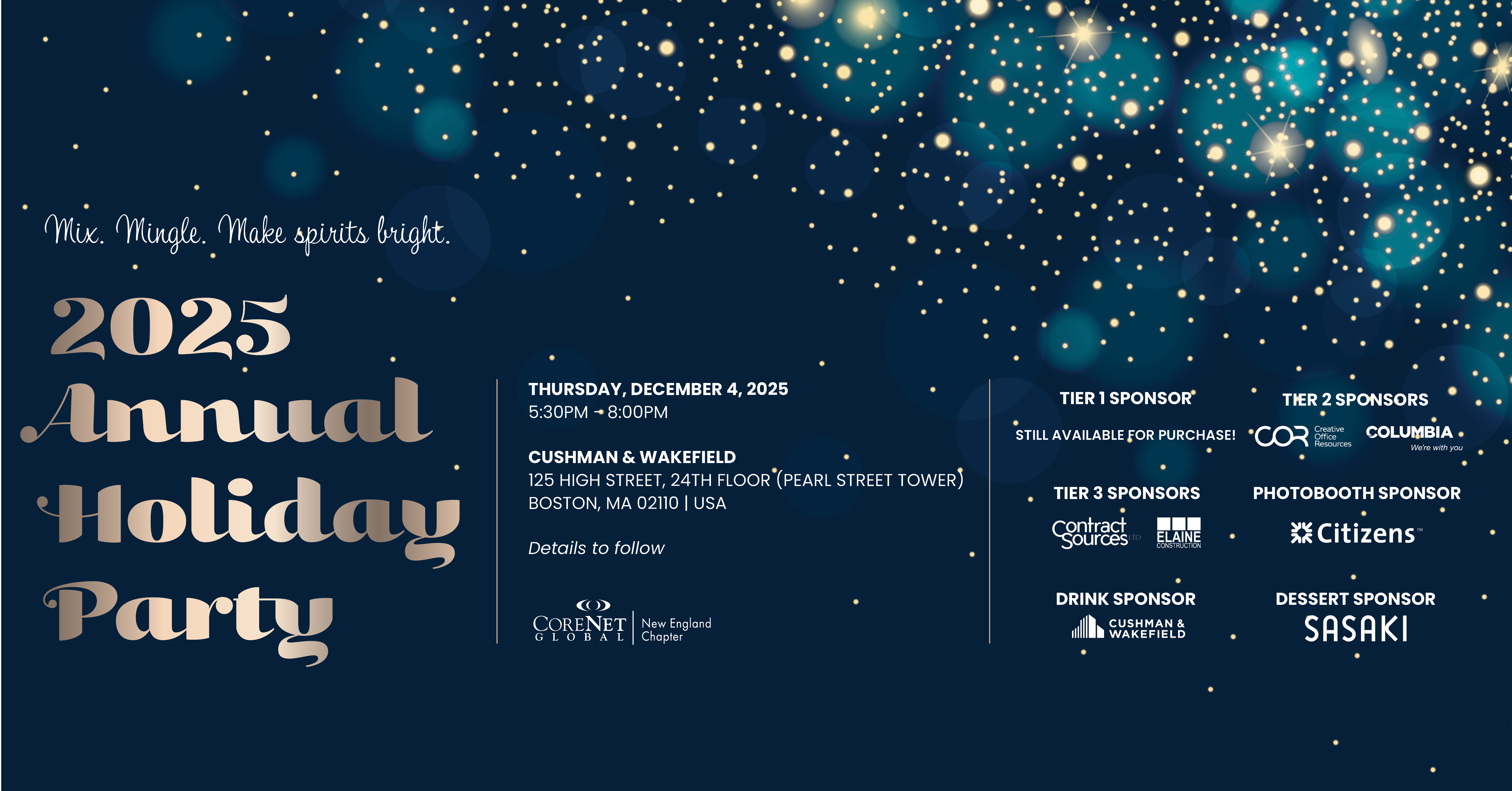 Join us for the CoreNet Global - New England Chapter Annual Holiday Party! Celebrate the year with industry peers, enjoy festive food and drinks, and support a great cause.