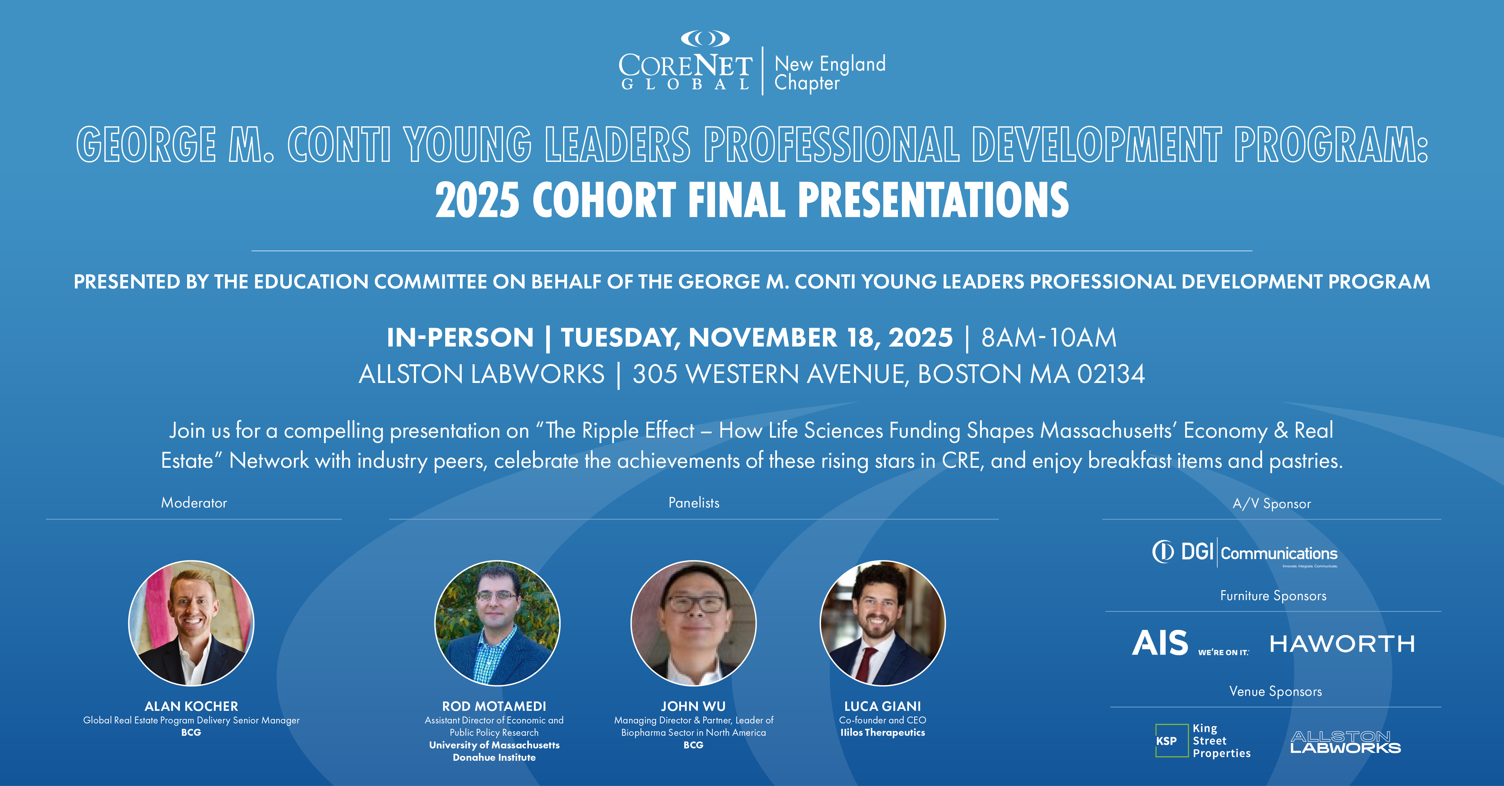 Coffee and light breakfast will be served! Join us for a compelling presentation on "The Ripple Effect – How Life Sciences Funding Shapes Massachusetts’ Economy & Real Estate." This presentation is fully prepared and facilitated by the 2025 Cohort of the George M. Conti Young Leaders Professional Development Program as their Capstone Project.